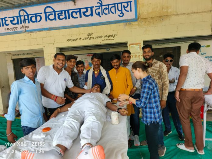 शाहपुरा भीलवाड़ा शाहपुरा जिला मुख्यालय के दौलतपुरा गांव में सहयोग सेवार्थ फाउंडेशन भीलवाड़ा , कामधेनु सेना एवं समस्त ग्रामवासी दौलतपुरा के संयुक्त तत्वधान में कारगिल विजय दिवस पर चतुर्थ रक्तदान शिविर का आयोजन राजकीय उच्च माध्यमिक विद्यालय दौलतपुरा में किया गया जिसमें 49 यूनिट रक्तदान कर भारत माता के वीर जवानों को समर्पित किया गया इस अवसर पर 100 विद्यार्थियों को शिक्षण सामग्री वितरण की गई।