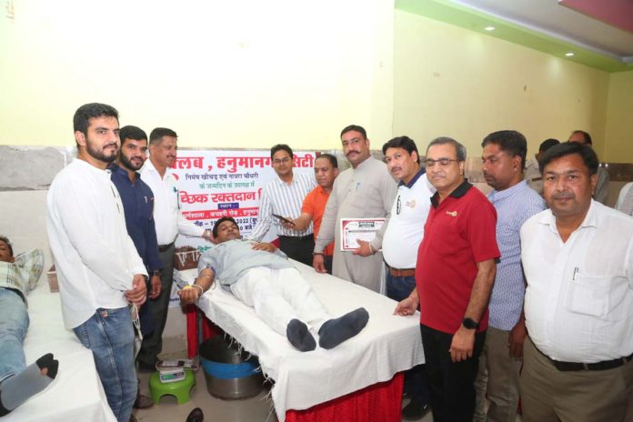 हनुमानगढ़। रक्तदान के प्रति आमजन में जागरूक पैदा करने के उद्देश्य से राजकीय विद्यालय मक्कासर के अध्यापक दिनेश खीचड़ ने अपने बच्चों के जन्मदिन पर रोटरी क्लब हनुमानगढ़ सिटी के सहयोग से जंक्शन जाट भवन में रक्तदान शिविर का आयोजन किया। रक्तदान शिविर के मुख्य अतिथि जिला कलक्टर नथमल डिडेल, विशिष्ट अतिथि सेवानिवृत गिरदावर रामसिंह खिचड़, सभापति गणेशराज बंसल, आग्रोहा विकास टस्ट के अध्यक्ष सतीश बंसल, निर्माण समिति अध्यक्ष सुमित रणवां, जिला केमिस्ट एसोसिएशन अध्यक्ष राजेश बंसल जल संसाधन विभाग के मुख्य अभियंता अमरजीत मेहरड़ा थे। रक्तदान शिविर में हनुमानगढ़ टाउन व जंक्शन सहित आस पास के गांवों से युवाओं ने भारी उत्साह से भाग लिया। कार्यक्रम को संबोधित करते हुए जिला कलक्टर नथमल डिडेल ने कहा कि बच्चों के जन्मदिन पर विशाल रक्तदान शिविर लगाना यह अनोखी पहल लोगों में जागरूकता लाएगी। ऐसे जागरूकता कार्यक्रमों से आम जनमानस जागरूक होने के साथ-साथ हम दूसरों को जीवन देने का भी कार्य करते हैं। रक्तदान महादान है। इसलिए सभी लोगों को हर शुभ मौके त्यौहार पर अपने जीवन में रक्तदान जरूर करना चाहिए। उक्त शिविर में 131 युनिट रक्त संग्रह किया गया। इस मौके पर जिला कलक्टर नथमल डिडेल, अध्यापक दिनेश खीचड़, रोटरी क्लब सिटी अध्यक्ष पुरूषोत्तम बंसल, सचिव अमित गोयल, कोषाध्यक्ष अमन गुप्ता, डॉ. प्रदीप सहारण, भारतेन्दु सैनी, आदित्य गुप्ता, रामनिवास मांडण ने रक्तदान करने वाले रक्तदाताओं का प्रशस्ति पत्र देकर सम्मानित किया।