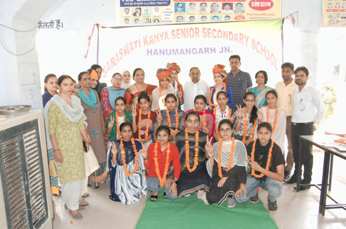 हनुमानगढ़। सरस्वती कन्या उच्च माध्यमिक विद्यालय, हनुमानगढ़ जं० में उच्च माध्यमिक का शानदार परीक्षा परिणाम रहा। विज्ञान व कला वर्ग की अव्वल रही छात्राओं को विद्यालय प्रबंध समिति के अध्यक्ष गणेशराज बंसल, वरिष्ठ उपाध्यक्ष सुरेन्द्र बलाड़िया, उपाध्यक्ष लखवीर सिंह मान, सचिव अमरनाथ सिंगला, उप सचिव अनिल बंसल, कोषाध्यक्ष अशोक सिंगला, महाविद्यालय प्राचार्य डॉ. श्याम सुन्दर शर्मा तथा प्रधानाचार्या श्रीमती प्रेरणा रस्तोगी व विद्यालय स्टाफ के द्वारा तिलक लगाकर, माला, साफा पहनाकर एव स्मृति चिन्ह देकर सम्मानित किया। विद्यालय प्रधानाचार्य प्रेरणा रस्तोगी ने बताया कि विज्ञान वर्ग में सर्वाधिक अंक कु० गायत्री 83 प्रतिशत, कला वर्ग में नूरजहां 82.20 प्रतिशत, लक्ष्मी 81.20 प्रतिशत, देवेन्द्र 80.60 प्रतिशत अंक प्राप्त कर विद्यालय का गौरव बढ़ाया। हर वर्ष की भांति इस वर्ष भी परीक्षा परिणाम शत् प्रतिशत रहा। विज्ञान वर्ग में समस्त छात्राएं 100 प्रतिशत प्रथम श्रेणी से उत्तीर्ण हुई। प्रतिभाशाली 15 छात्राऐं गार्गी पुरस्कार से सम्मानित होगी। विद्यालय प्रबंध समिति के पदाधिकारियों व प्रधानाचार्या की ओर से समस्त छात्राओं व उनके अभिभावकों को हार्दिक बधाई दी। प्रबंध समिति सचिव अमरनाथ सिंगला ने छात्राओं के उज्ज्वल भविष्य की कामना करते हुए छात्राओं को जिले में अत्यधिक अंक लाने व मेरिट में आने पर उन्हें प्रोत्साहित करते हुए कहा कि अन्य बेटियों को भी इन बेटियों से प्रेरणा लेकर प्रतिस्पर्धा की भावना रखते हुए आगे बढ़ना चाहिए।