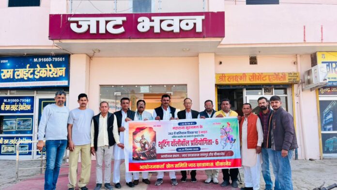 हनुमानगढ़। जाट भवन हनुमानगढ़ में जाट समाज समिति हनुमानगढ़ द्वारा महाराजा सूरजमल के 262वें बलिदान दिवस के उपलक्ष्य में आयोजित होने वाली शूटिंग वॉलीबॉल प्रतियोगिता के पोस्टर का विमोचन किया गया। यह प्रतियोगिता बीकानेर खेल समिति जाट छात्रावास, बीकानेर में 24 और 25 दिसम्बर को आयोजित की जाएगी, जिसमें प्रदेशभर से टीमें प्रतिभाग करेंगी।
