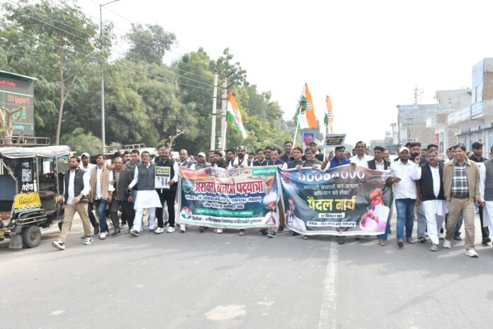 हनुमानगढ़ जिला कांग्रेस कमेटी के तत्वावधान में आज हनुमानगढ़ जंक्शन स्थित अंबेडकर चौक से “अरावली बचाओ जनजागरण अभियान” के तहत एक विशाल पैदल मार्च निकाला गया। इस दौरान कांग्रेस कार्यकर्ताओं ने अरावली पर्वत क्षेत्र में हो रहे अवैध खनन और न्यायालय द्वारा दिए गए आदेशों के विरोध में जिला कलेक्टर कार्यालय पर पहुंचकर जोरदार रोष प्रदर्शन किया। यह पैदल मार्च प्रदेश कांग्रेस कमेटी के निर्देशानुसार आयोजित किया गया, जिसमें जिलेभर से बड़ी संख्या में कांग्रेसजन शामिल हुए।