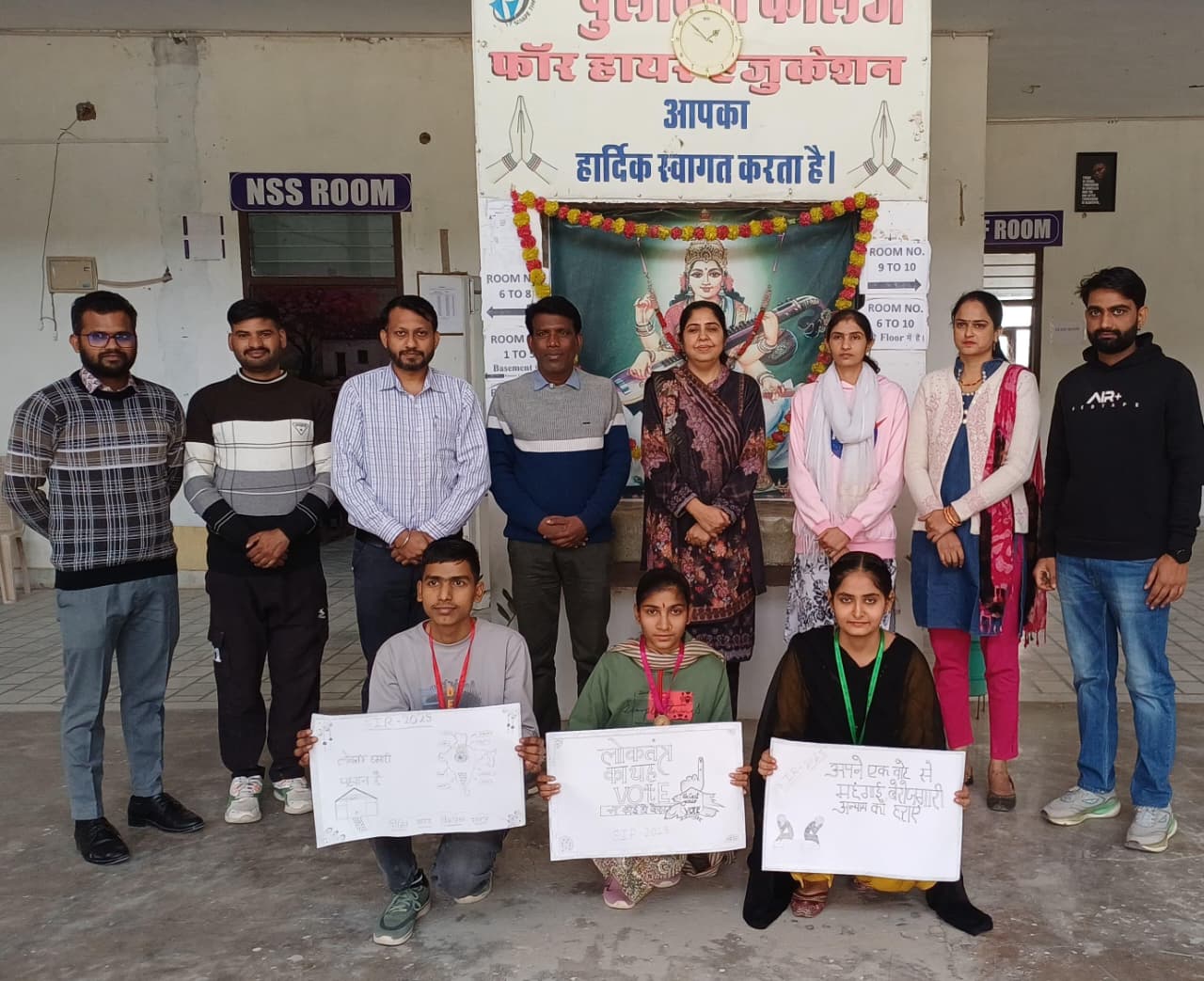 हनुमामगढ़। जंक्शन के पुलकित कॉलेज फॉर हायर एजुकेशन, हनुमानगढ़ जंक्शन में सरकार द्वारा संचालित विशेष गहन पुनरीक्षण 2026 अभियान के तहत व्यापक प्रचार-प्रसार हेतु स्वीप गतिविधियों के अंतर्गत विद्यार्थियों में जागरूकता लाने के लिए चित्रकला प्रतियोगिता का सफल आयोजन किया गया। इस प्रतियोगिता में विभिन्न विद्यार्थियों ने उत्साहपूर्वक भाग लिया। प्राचार्या डॉ. चंद्रा गुरनानी ने विद्यार्थियों को एस.आई.आर. के बारे में विस्तार से जानकारी दी तथा बच्चों को सम्बोधित करते हुये कहा कि समाज में जागरूकता फैलाने का दायित्व हम सभी का है। आज की चित्रकला प्रतियोगिता ने सिद्ध किया है कि आप न केवल सृजनशील हैं, बल्कि सामाजिक मुद्दों के प्रति संवेदनशील भी हैं। आपके द्वारा बनाए गए प्रत्येक चित्र ने जागरूकता की एक नई दिशा दिखाई है। आप इसी प्रकार ज्ञान, रचनात्मकता और जिम्मेदारी के साथ आगे बढ़ते रहें यही हमारी सच्ची अपेक्षा है।” प्रतियोगिता ई.एल.सी. प्रभारी श्री पंकज वर्मा के निरीक्षण में सम्पन्न हुई। जिसमें-प्रथम स्थानः तृतीय सेमेस्टर का छात्र जतिन, द्वितीय स्थानः तृतीय सेमेस्टर की छात्रा पूजा व तृतीय स्थानः तृतीय सेमेस्टर की छात्रा यासमीन ने प्राप्त किया। कार्यक्रम में श्री महेंद्र कुमार, कुलदीप सिंह, मुकेश कुमार, निशान्त प्रियंका, अल्का शर्मा आदि सदस्य उपस्थित रहे।