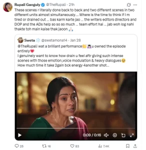 सोशल मीडिया पर कई लोगों ने रूपाली गांगुली की जमकर तारीफ की। एक यूजर ने लिखा कि इतनी इमोशनल और दमदार एक्टिंग करना आसान नहीं होता। इस पर रूपाली गांगुली ने जवाब देते हुए बताया कि ऐसे सीन की शूटिंग लगातार और अलग-अलग यूनिट्स में होती है, इसलिए थकने के बारे में सोचने का वक्त ही नहीं मिलता। उन्होंने कहा कि यह पूरी टीम की मेहनत का नतीजा है।