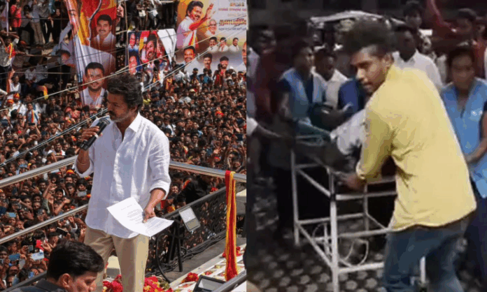 पुलिस के अनुसार, रैली के लिए केवल 10 हजार लोगों की अनुमति थी, लेकिन 50 हजार से ज्यादा लोग 1 लाख 20 हजार स्क्वायर फीट के क्षेत्र में इकट्ठा हो गए। विजय को बताया गया कि 9 साल की एक बच्ची गुम हो गई है। उन्होंने मंच से लोगों से उसकी तलाश करने की अपील की, और इसी दौरान भगदड़ शुरू हो गई।