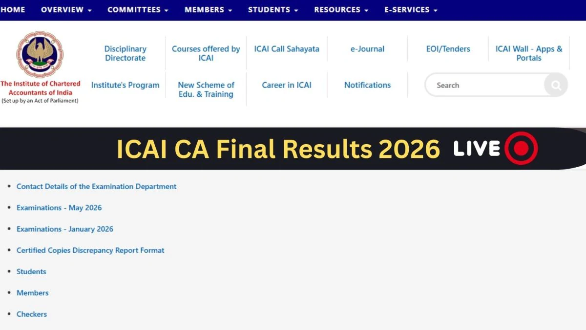 इंस्टीट्यूट ऑफ चार्टर्ड अकाउंटेंट्स ऑफ इंडिया (ICAI) आज CA Final Result जनवरी 2026 परीक्षा का रिजल्ट जारी करेगा। जो उम्मीदवार 5 जनवरी 2026 से आयोजित परीक्षा में शामिल हुए थे, वे आधिकारिक वेबसाइट icai.nic.in पर जाकर अपना स्कोरकार्ड डाउनलोड कर सकेंगे।