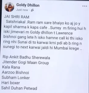 लॉरेंस गैंग से जुड़े गोल्डी ढिल्लो का एक पोस्ट वायरल हो रहा है, इसमें वह कपिल के कैफे पर फायरिंग की जिम्मेदारी ले रहा है। यह पोस्ट किस सोशल साइट पर किया गया है। यह साफ नहीं है।