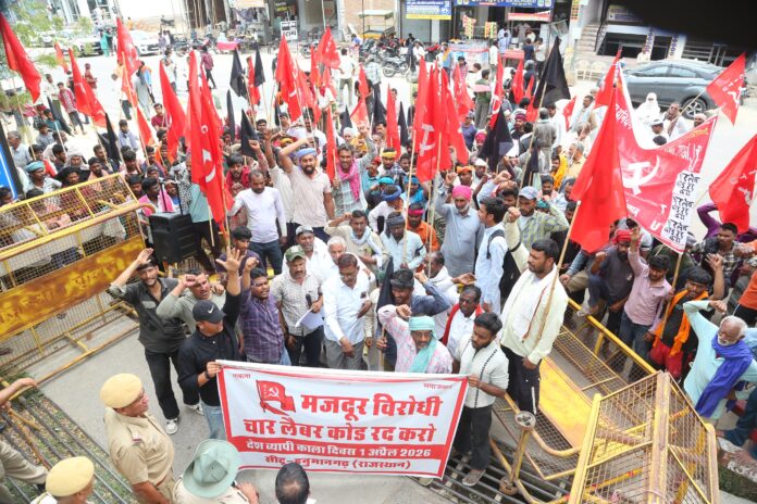 हनुमानगढ़। केंद्र सरकार द्वारा चार श्रम संहिताओं को लागू किए जाने के विरोध में मंगलवार को जिले में श्रमिक संगठनों ने ‘राष्ट्रव्यापी काला दिवस’ मनाया। इस दौरान सीटू सहित विभिन्न ट्रेड यूनियनों के बैनर तले श्रमिकों ने काले बैज लगाकर विरोध प्रदर्शन किया और जंक्शन धानमंडी से जिला कलेक्ट्रेट तक रोष मार्च निकाला।