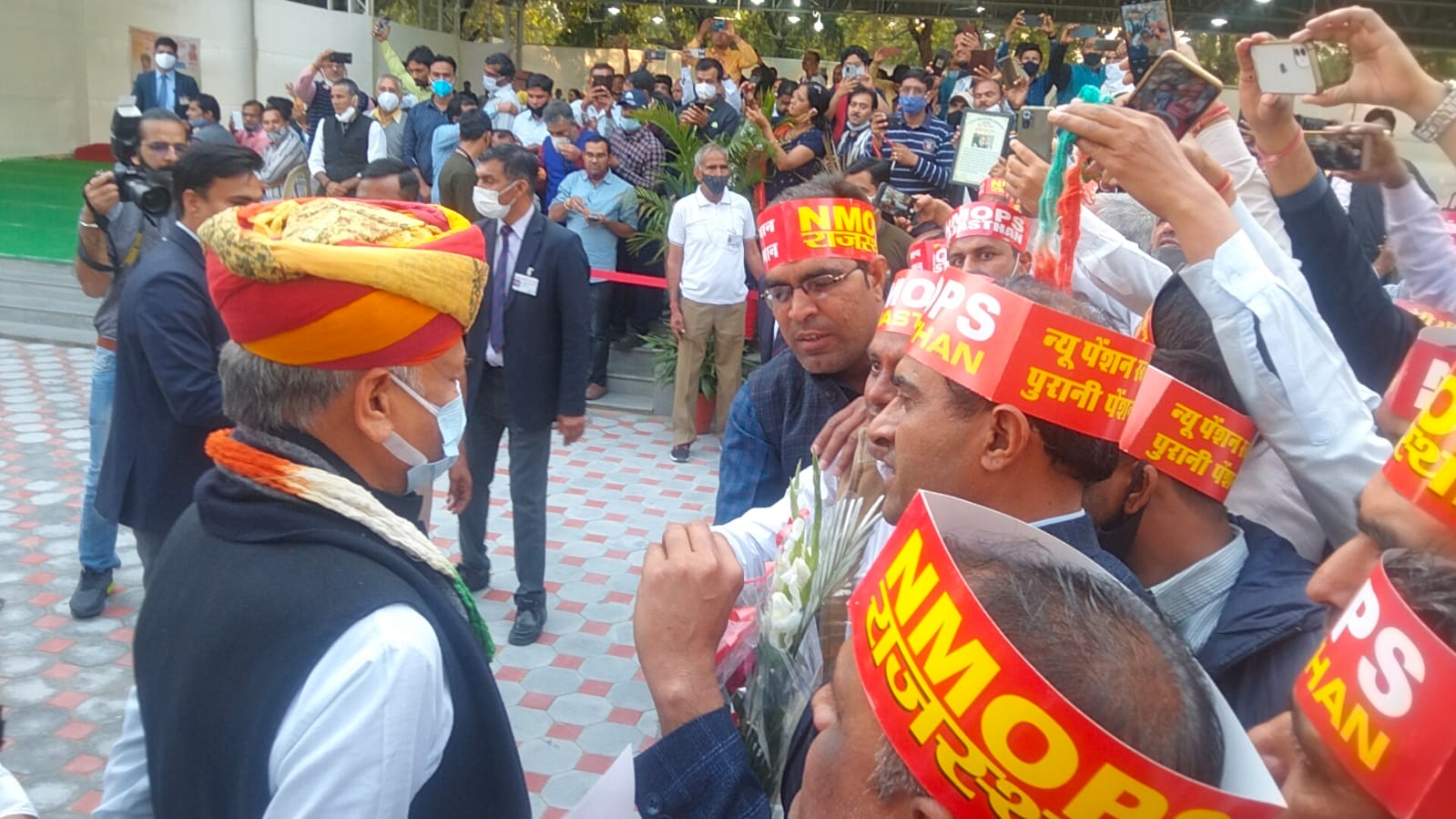 जिला संवाददाता भीलवाड़ा। पुरानी पेंशन बहाली की ऐतिहासिक घोषणा करने पर एनएमओपीएस राजस्थान इकाई की ओर से मुख्यमंत्री अशोक गहलोत का आज सिविल लाइन स्थित आवास पर पहुंच कर सैकड़ो की तादात में राज्य में 2004 के बाद लगे कर्मचारियों की पुरानी पेंशन बहाली करने की राज्य बजट में घोषणा करने पर एमएमओपीएस की राजस्थान टीम ने राष्ट्रीय नेतृत्व का अभिनन्दन पत्र व पगड़ी पहनाकर अभिनन्दन किया। पूरे देश से मिल रहे कर्मचारी संगठनों के बधाई संदेशों से भी मुख्यमंत्री को अवगत कराया। कर्मचारी व अधिकारी मुख्यमंत्री के इस ऐतिहासिक कदम की भूरी भूरी प्रंशसा कर रहे है।मुख्यमंत्री गहलोत जिन्दाबाद के नारों से सिविल लाइन गुँज उठा।इस मौके पर आन्दोलन के प्रदेश अध्यक्ष कोजाराम सिहाग,प्रदेश महासचिव जगदीश यादव,प्रदेश उपाध्यक्ष जयकरण खिलेड़ी,मोहन ऐचरा,प्रदेश सोशल मिडिया प्रभारी सलीम डायर व सभी जिलों व ब्लाॅक संयोजक के साथ सैकड़ो संघर्षशील कर्मचारी शामिल हुए।मुख्यमंत्री ने सभी कर्मचारियों का आभार जताया व राज्य में सुशासन स्थापित करने में सरकार का साथ देने की बात कही।