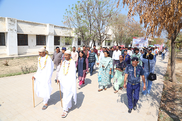 हनुमानगढ़। जिला मुख्यालय पर मंगलवार को राजकीय पॉलिटेक्निक कॉलेज से पुलिस थाना सुरेशिया तक शांति एवं अहिंसा कार्यालय द्वारा दांडी मार्च का आयोजन किया गया। महात्मा गांधी ने अंग्रेजों के नमक कानून को तोड़ने के लिए 12 मार्च, 1930 को दांडी मार्च का आयोजन किया था। राजकीय पॉलिटेक्निक कॉलेज में हुए कार्यक्रम में गांधी जी की प्रतिमा के समक्ष पुष्प अर्पित किए गए तथा दांडी मार्च पर बनी डॉक्यूमेंट्री का प्रदर्शन किया गया। जिला परिषद सीईओ सुश्री सुनीता चौधरी ने गांधी जी के जीवन के बारे में विस्तार से बताया। सुश्री चौधरी ने बताया कि गांधी जी को एक व्यक्ति के रूप में न देखकर जीवन जीने के तरीके के रूप में देखना चाहिए। आज की युवा पीढ़ी को गांधी जी के जीवन से सीख लेनी चाहिए। कार्यक्रम के मुख्य अतिथि जिला विधिक सेवा प्राधिकरण के सचिव श्री धनपत माली ने कहा कि विद्यार्थीयों को गांधी जी से संयम, धैर्य, ईमानदारी और सत्यता सीखनी चाहिए।