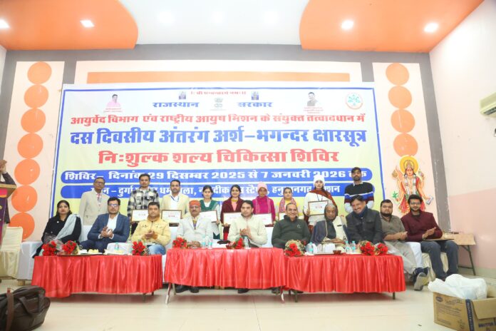 हनुमानगढ़। राष्ट्रीय आयुष मिशन एवं आयुष मंत्रालय, भारत सरकार के तत्वावधान में जंक्शन स्थित दुर्गा मंदिर धर्मशाला में आयोजित 10 दिवसीय निशुल्क आयुर्वेदिक क्षार सूत्र शल्य चिकित्सा एवं रोग निदान शिविर का बुधवार को समारोहपूर्वक समापन किया गया। समापन समारोह में बड़ी संख्या में चिकित्सक, समाजसेवी, स्वयंसेवक एवं आमजन उपस्थित रहे। कार्यक्रम का आयोजन उत्साहपूर्ण वातावरण में किया गया, जिसमें शिविर की उपलब्धियों और सेवाओं की सराहना की गई।