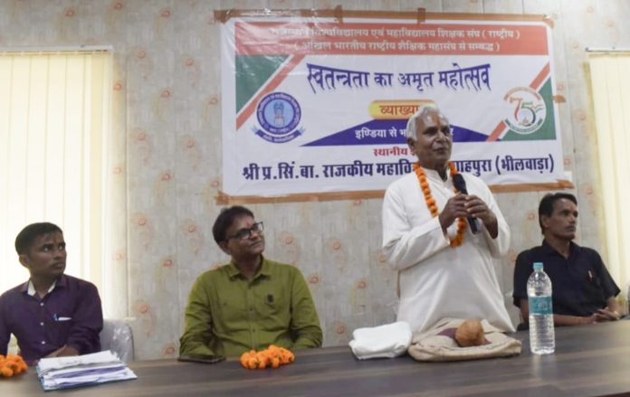 संवाददाता शाहपुरा। शाहपुरा महाविद्यालय की रूक्टा (राष्ट्रीय) की इकाई के तत्त्वावधान में आयोजित स्वतन्त्रता के अमृत महोत्सव व्याख्यान का कार्यक्रम प्राचार्य प्रो. रामावतार मीना की अध्यक्षता एवं सेवानिवृत प्राचार्य डॉ. श्यामसुन्दर भट्ट के मुख्य आतिथ्य में आयोजित हुआ। मुख्य वक्ता डॉ.भट्ट ने शहीद कुँवर प्रताप सिंह बारहठ को नमन करते हुए अपनी संस्कृति, परम्पराओं और बलिदान को निरन्तर स्मरण रखने की सीख दी। उन्होनें चेतावनी रा चुग्ट्या” के माध्यम से विद्यार्थियों द्वारा किये जा रहे पाश्चात्य संस्कृति के अंधानुकरण के प्रति करारा व्यंग्य किया। प्राचार्य प्रो. रामावतार मीना ने मन व मस्तिष्क से विदेशी मानसिकता की बेडियों को तोडकर अपनी संस्कृति के उच्च तत्वों को ग्रहण करने की बात की। रुक्टा (राष्ट्रीय) जिला कार्यकारणी सदस्य एवं स्थानीय इकाई सचिव डॉ. पुष्करराज मीणा ने आजादी अमृत महोत्सव विषय को विस्तार से सबके सामने प्रस्तुत किया तथा इस आयोजन की प्रासंगिकता बताते हुए इस महोत्सव की पांचों थीम को समझाया। इस अवसर पर संकाय सदस्य डॉ. ऋचा अंगिरा, डॉ. रंजीत जगरिया, प्रो. जयकृष्ण त्रिपाठी, डॉ. हंसराज सोनी, प्रो. दिग्विजय सिंह और विद्यार्थी उपस्थित रहे। कार्यक्रम का संचालन छात्रा जयश्री शर्मा ने किया । रुक्टा (राष्ट्रीय) की ओर से प्रो. धर्मनारायण वैष्णव ने सभी अतिथियों व वक्ताओं का आभार व्यक्त किया।