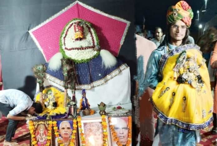 शाहपुरा भीलवाड़ा शाहपुरा जिला मुख्यालय के जहाजपुर रोड पर धरती देवरा के स्थान पर देर शाम से अर्धरात्रि पश्चात तक खाटू श्याम एवं बाबू लड्डू गोपाल पर एवं पूर्वी के जन्मोत्सव पर भजन संध्या का कार्यक्रम आयोजित किया गया बाबू लड्डू गोपाल को चांदी का मुकुट भेंट किया कस्बे वासियों ने इत्र एवं पुष्प वर्षा कर भगवान के समक्ष मंगल गीत गाए एवं नाना प्रकार के व्यंजन प्रस्तुत किए महा आरती की एवं देर रात्रि भजन संध्या के पश्चात बाबू लड्डू गोपाल को परिपाटी एवं धर्मानुसार शयन कराया गया जानकारी के अनुसार बाल संत ऋषभ ठाकुर एवं सनी राव ने बताया कि बाबू लड्डू गोपाल एवं भगवान खाटू श्याम की झांकी एवं प्रतिमा के समक्ष पूर्वी के जन्मोत्सव पर संकीर्तन भजन संध्या का कार्यक्रम चित्तौड़ की उमा शर्मा हुरडा के अखिलेश दाधीच एवं गुलाबपुरा की अक्षी नागर के सुरीली गायकी से संगीतमय भजन संध्या आयोजित की गई जो अर्धरात्रि एवं भोर होने तक कस्बे वासी एवं श्रद्धालु भजनों की बहार में भाव विभोर होकर भक्ति रस में भगवान खाटू श्याम की झांकी एवं बाबू लड्डू गोपाल की चमत्कारी प्रतिमा के समक्ष भजनों पर नाचते रहे भगवान के भक्तों द्वारा बाबू लड्डू गोपाल और चांदी का मुकुट भेंट किया गया इस मौके पर आयोजक गर्ग परिवार दिनेश गिरिराज राजेश भूपेश अभी परी सिद्धि नव्या एवं प्रकाश आदित्य लवली लक्ष्मी सोनी आदि भक्तजनों ने भगवान खाटू श्याम एवं बाबू लड्डू गोपाल की आरती के पश्चात महाप्रसाद वितरण किया।