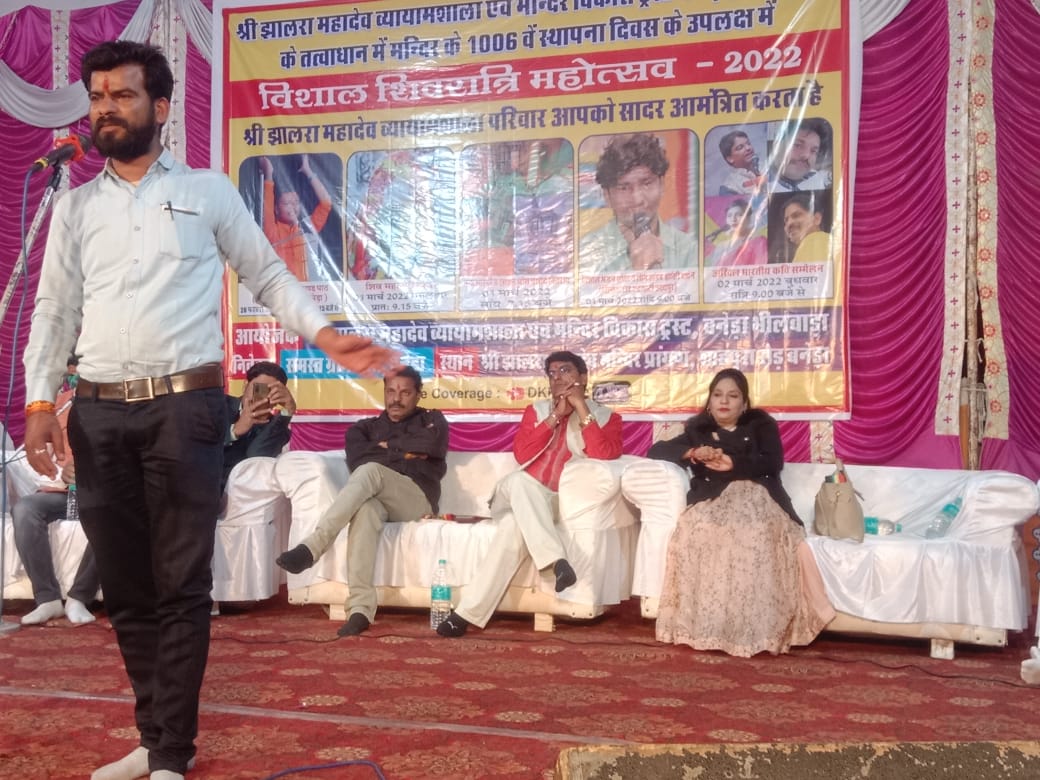 जिला संवाददाता भीलवाड़ा। झालरा महादेव मंदिर विकास समिति एवं बजरंग व्यायामशाला के तत्वावधान में चल रहे तीन दिवसीय मेले के अंतिम दिन बनेड़ा में आयोजित कवि सम्मेलन देर रात तक चला। कवि सम्मलेन की अध्यक्ष्ता राजाधिराज बनेड़ा गोपाल सिंह जी ने की तथा समाजसेवी एवं शाहपुरा के युवा पार्षद श्री राजेश सोलंकी मुख्य अतिथि एवं सम्पत माली सरपंच बनेड़ा एवं देबी लाल माली उपसरपंच कार्यक्रम के वशिष्ट अतिथि थे। सर्व प्रथम भोपाल से आई कवियत्री साबिया असर ने माँ सरस्वती की आराधना शब्दों का गुलदस्ता लेकर गीत में तेरे गाऊंगी। तत्पश्चात काछोला से आए गीतकार प्रभू प्रभाकर ने तीतरी क पाछै लोग तीतरी होरिया।भरतपुर से आए हास्य कवि जितेन्द्र जीतू ने हास्य कविता से सभी को खूब गुदगुदाया।कवि अर्जुन अल्हड़ चेचट कोटा ने एक घंटे तक हास्य में श्रोताओं को सराबोर करते हुए हँसते -हँसते भगत सिंह फांसी फंदे पर झूल गए। प्रतापगढ से आए हास्य पैरोड़ीकार पार्थ नवीन ने अपनी दमदार पैरोडियों से सभी को खूब गुदगुदाया। भोपाल से श्रृंगार रस की कवियत्री साबिया असर ने कार्यक्रम का संचालन कर रहे कवि दिनेश बंटी के बीच हुई नोक – जोक से सभी को आनंदित कर दिया। हास्य कवि दिनेश बंटी ने कोरोना काल में लगी पाबन्दी में कैसे मेहमानो को बुलाएँ इस पर हास्य पैरोडी भेज रहे है कार्ड तुम्हें पर आना नहीं कसम तुम्हें हाथ जोड़ के, अंतिम कवि के रूप में कोटा के ओज के हस्ताक्षर निशामुनि गोड़ ने भगत के ख्वाब और बिस्मिल के ये अरमान की धरती, शहीदों की इबादत है ये हिंदुस्तान की धरती। राम मंदिर आदि पर रचना सुनाकर श्रोताओं की खूब दाद पाई। समापन में अध्यक्षीय उद्बोधन में राजाधिराज गोपाल सिंह जी ने कवि सम्मलेन में आए सभी कवियों की रचनाओं को सराहा। आयोजन समिति की ओर से शंकर माली, कृष्ण कुमार भट्ट एवं ओमप्रकाश खोईवाल ने सभी का आभार प्रकट किया।