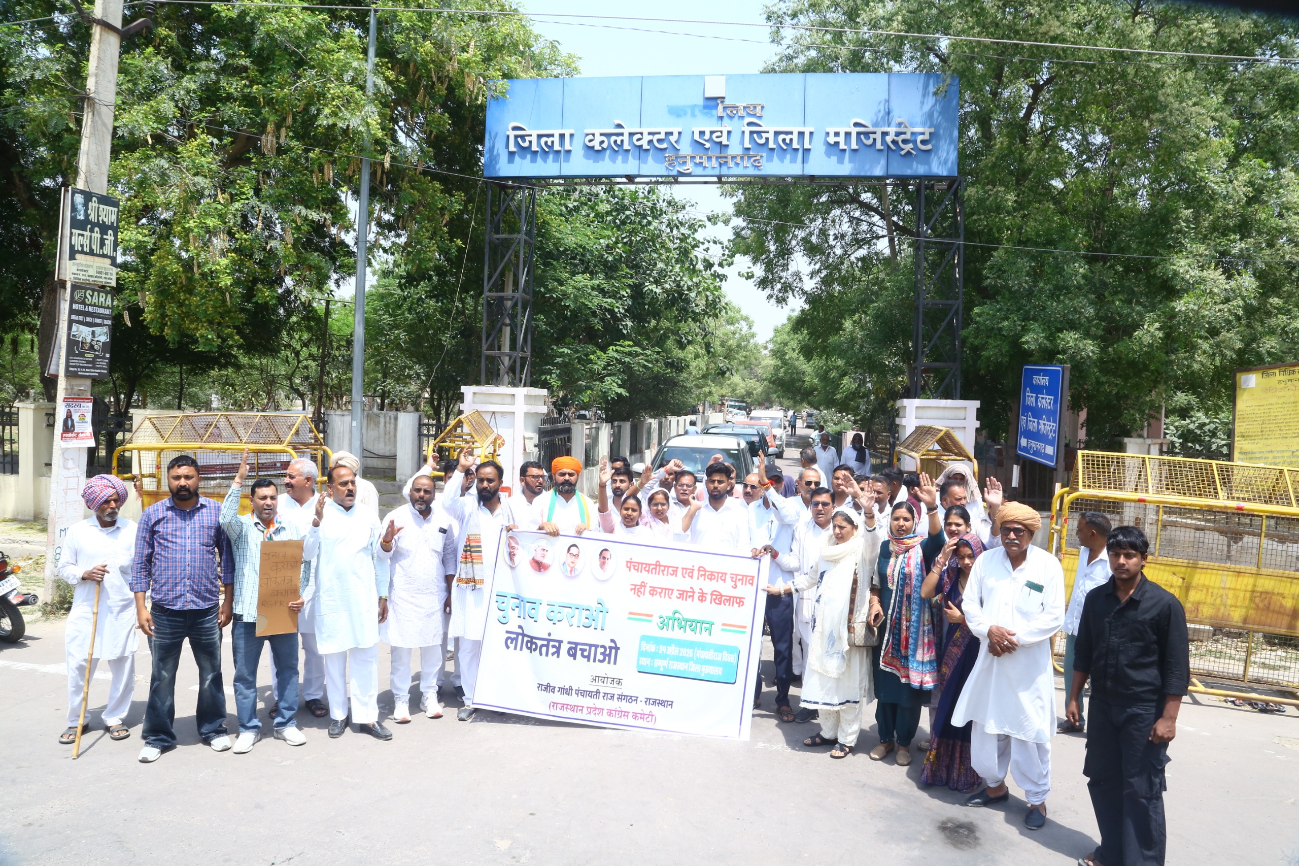 हनुमानगढ़। राजस्थान में पंचायतों एवं नगरीय निकायों के लंबे समय से लंबित चुनावों को लेकर अब विरोध के स्वर तेज होने लगे हैं। इसी क्रम में पंचायतीराज दिवस के उपलक्ष में प्रदेश कांग्रेस कमेटी के आह्वान पर राजीव गांधी पंचायती राज संगठन के बैनर तले कांग्रेस कार्यकर्ताओं ने जिला कांग्रेस कमेटी कार्यालय से जिला कलैक्ट्रैट तक रोष मार्च निकाला, जिसके बाद जिला प्रशासन को ज्ञापन सौंपकर शीघ्र चुनाव कराने की मांग उठाई गई। ज्ञापन में राजीव गांधी पंचायती राज संगठन के जिलाध्यक्ष वारिस अली ने बताया कि प्रदेश व केन्द्र की सरकार लोकतंत्र की हत्या करने पर जुटी है। संविधान के अनुसार पांच वर्ष बाद चुनाव करवाने व लोगों को उनके मतों का उपयोग करना आवश्यक होता है, परन्तु सात बरस बीतने के बाद भी सरकार चुनावों में देरी कर रही है। निकाय चुनाव को दो वर्ष व पंचायतीराज चुनाव में एक वर्ष से अधिक समय से चुनाव लंबित होने के कारण स्थानीय स्वशासन की लोकतांत्रिक व्यवस्था गंभीर रूप से प्रभावित हो रही है।