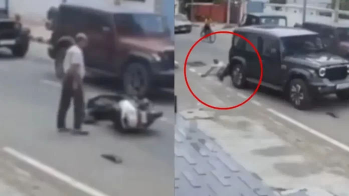इस घटना का 27 जुलाई का CCTV फुटेज सामने आया है। जिसमें साफ दिख रहा है कि गांधी नगर में अल्लोरा टेक्सटाइल्स के पास एक बुजुर्ग व्यक्ति की स्कूटी थार से टकरा गई। इससे स्कूटी सवार बुजुर्ग गिर जाता है।