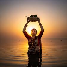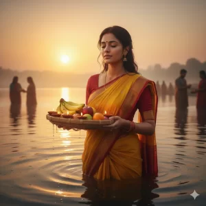 नदी में कमर तक पानी में खड़ी महिला, जिसने केसरिया साड़ी पहनी है और सूरज की ओर हाथ जोड़े हुए है। सूरज की रोशनी उसके चेहरे पर सुनहरी चमक बिखेर रही है।